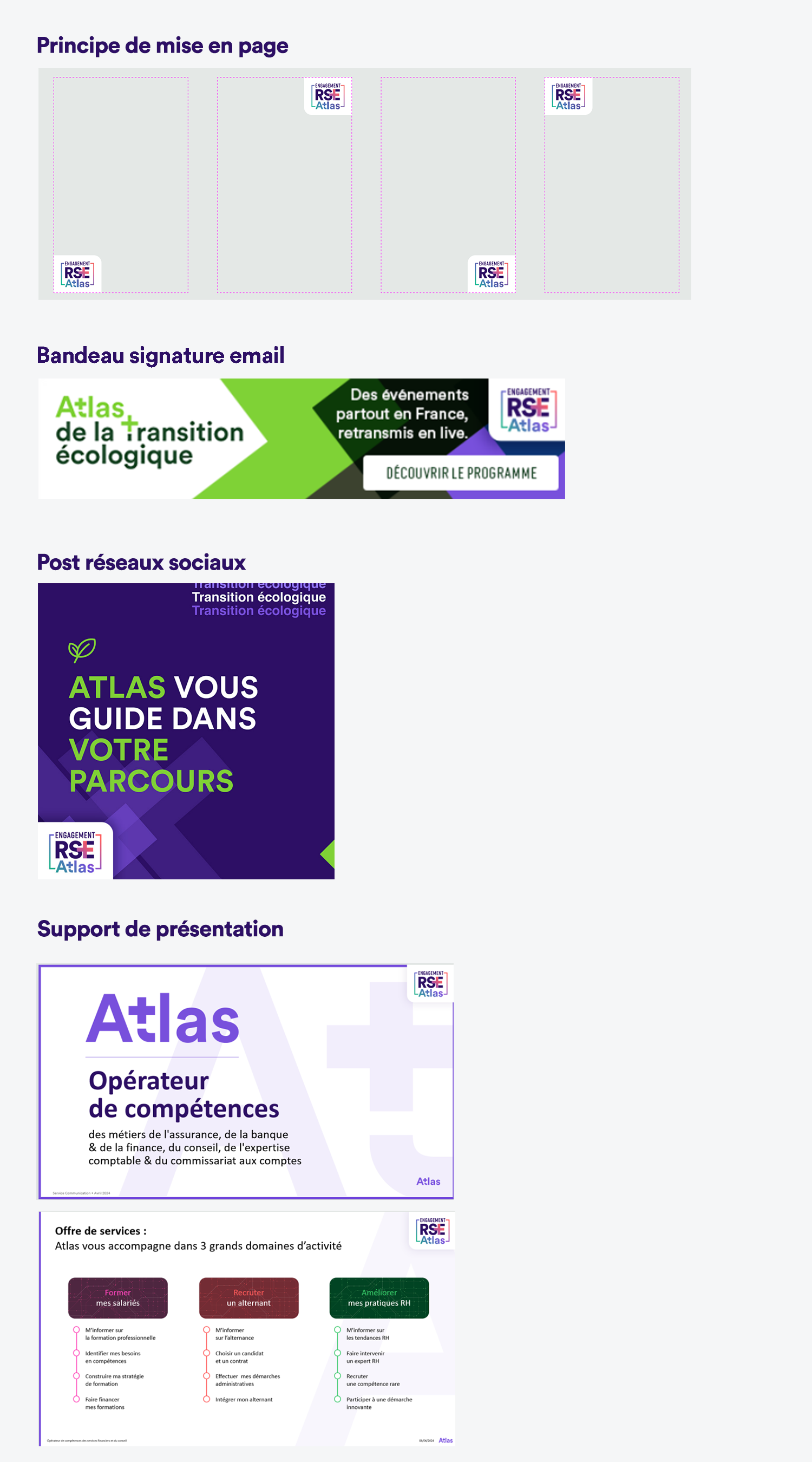 Engagement RSE Atlas Atlas s’engage pour la Responsabilité Sociétale des Entreprises (RSE) en intégrant des initiatives concrètes et en valorisant ses actions avec un logo dédié. Logo seul Bords carrés CMJNFormat eps, jpg, png, svg RVBFormat eps, jpg, png, svg Coins arrondis CMJNFormat ai, pdf RVBFormat ai, png Les règles d’applications Quelques règles d’applications vous guident sur l’utilisation du logo Engagement RSE Atlas sur vos supports de communication. Couleurs Pantone 7417 CCMJN02 / 84 / 65 / 00RVB234 / 80 / 83Hexa#ea5053 Pantone 7655 CCMJN41 / 79 / 23 / 02RVB158 / 83 / 132Hexa#9e5384 Pantone 7672 CCMJN75 / 69 / 00 / 00RVB89 / 95 / 161Hexa#595fa1 Pantone 7702 CCMJN76 / 29 / 32 / 01RVB60 / 144 / 161Hexa#3c90a1 Pantone 3265 CCMJN77 / 06 / 58 / 00RVB28 / 173 / 140Hexa#1cad8c ClubRHAutres supports Marques corporateInventer les CFA de demain